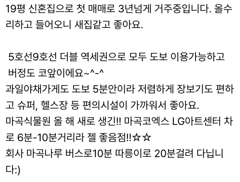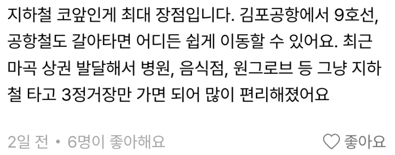 장점은 5호선 초역세권이며 5호선을 타고 한 정거장만 이동하면 9호선, 5호선, 공할철도, 서해선, 김포골드라인을 이용할 수 있는 김포공항역이 있습니다. 김포공항역에 롯데 백화점 김포공항점이 있는 것도 장점이죠.