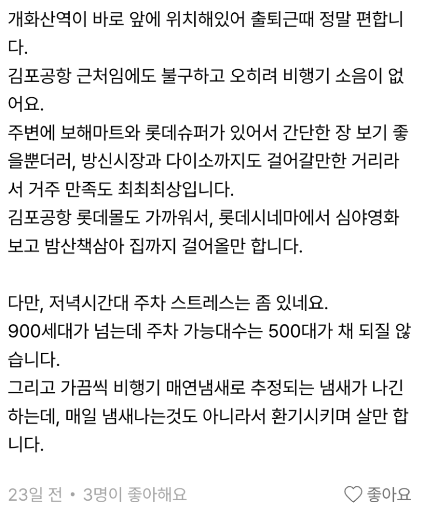 그 외엔 전반적으로 살기 편하고 안정적인 단지로 평가받고 있습니다.