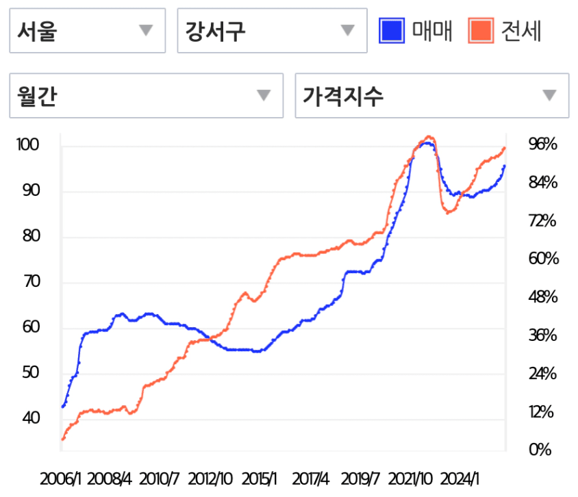 강서구는 지난 22년 최고점을 찍은 후 23년까지 하락세를 보였으나 그 이후 현재까지 상승세를 이어가고 있으며 전고점을 넘어가는 단지들도 있습니다.