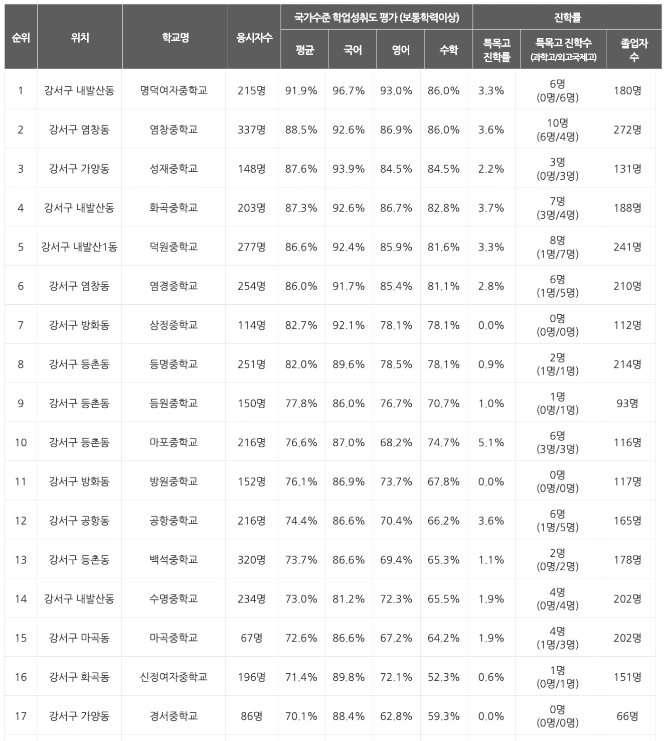 강서구에 있는 중학교 학업성취도 평가를 살펴볼게요