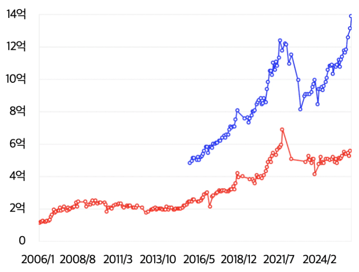 위 그래프는 같은 구 안에서 오늘 소개해드릴 아파트(빨간색)와 지하철 정거장으로 다섯정거장 떨어져 있는 있는 아파트(파란색)의 가격을 비교한 그래프입니다.