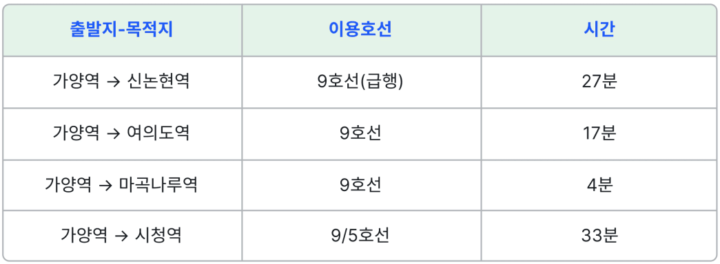 가양역 기준 주요 업무지구까지의 시간은 다음과 같아요