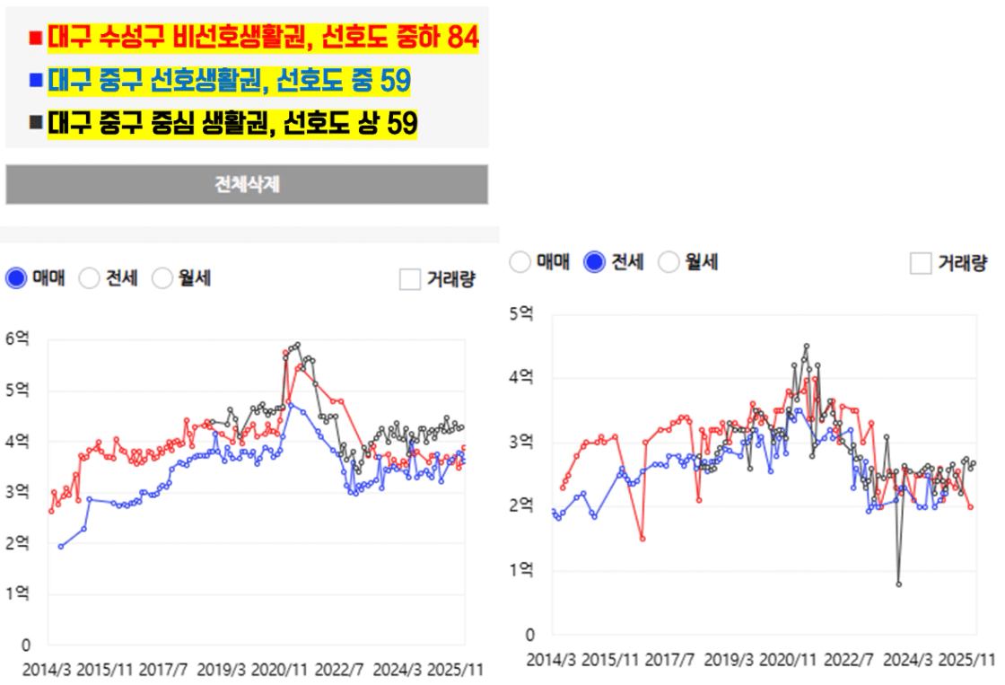 특히 대구의 경우 신축 단지들이 정말 많아 준신축도 선호도가 흔들리고 있는데요