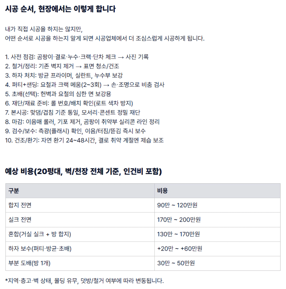 - 곰팡이/결로 있다면 락스 칠만으론 부족, 방균 프라이머+통풍/단열 보완까지 시공 필요.