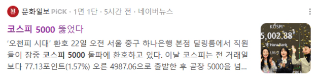 오늘 코스피 지수가 5000을 넘겼습니다.