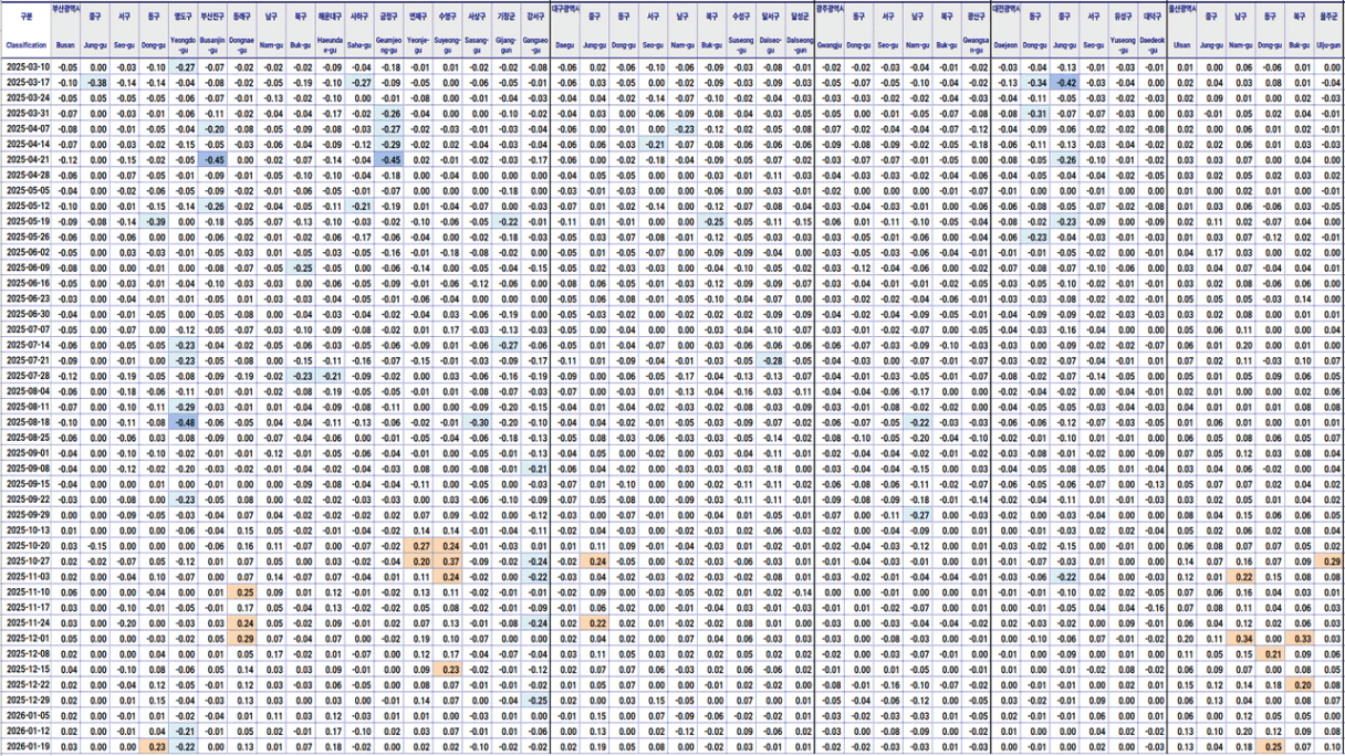 북구, 남구 모두 하락하는 모습을 보여주고 있습니다.