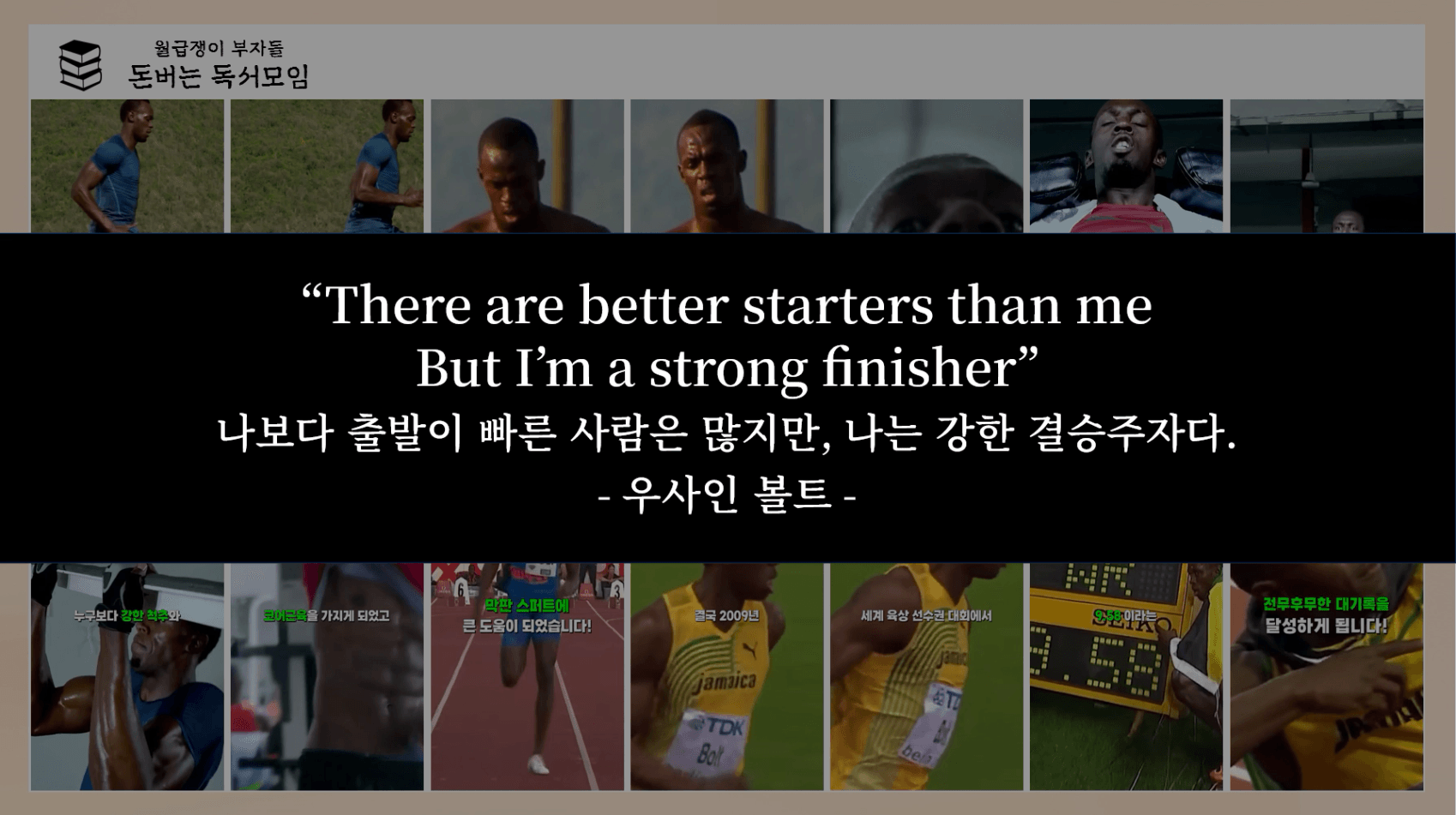 우사인볼트가 남긴 명언처럼, 출발이 늦거나 뒤쳐졌더라도