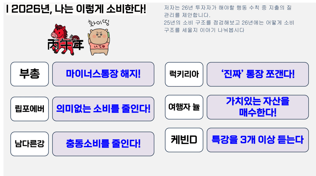 마지막으로 모두가 2026년의 건강한 소비를 위한 다짐을 말해보고, 작게나마 목표, 설정, 환경 만들어 드릴 수 있었던 시간 감사합니다. 또한 저 스스로도 다시 한 번 목표를 새겨볼 수 있었습니다.