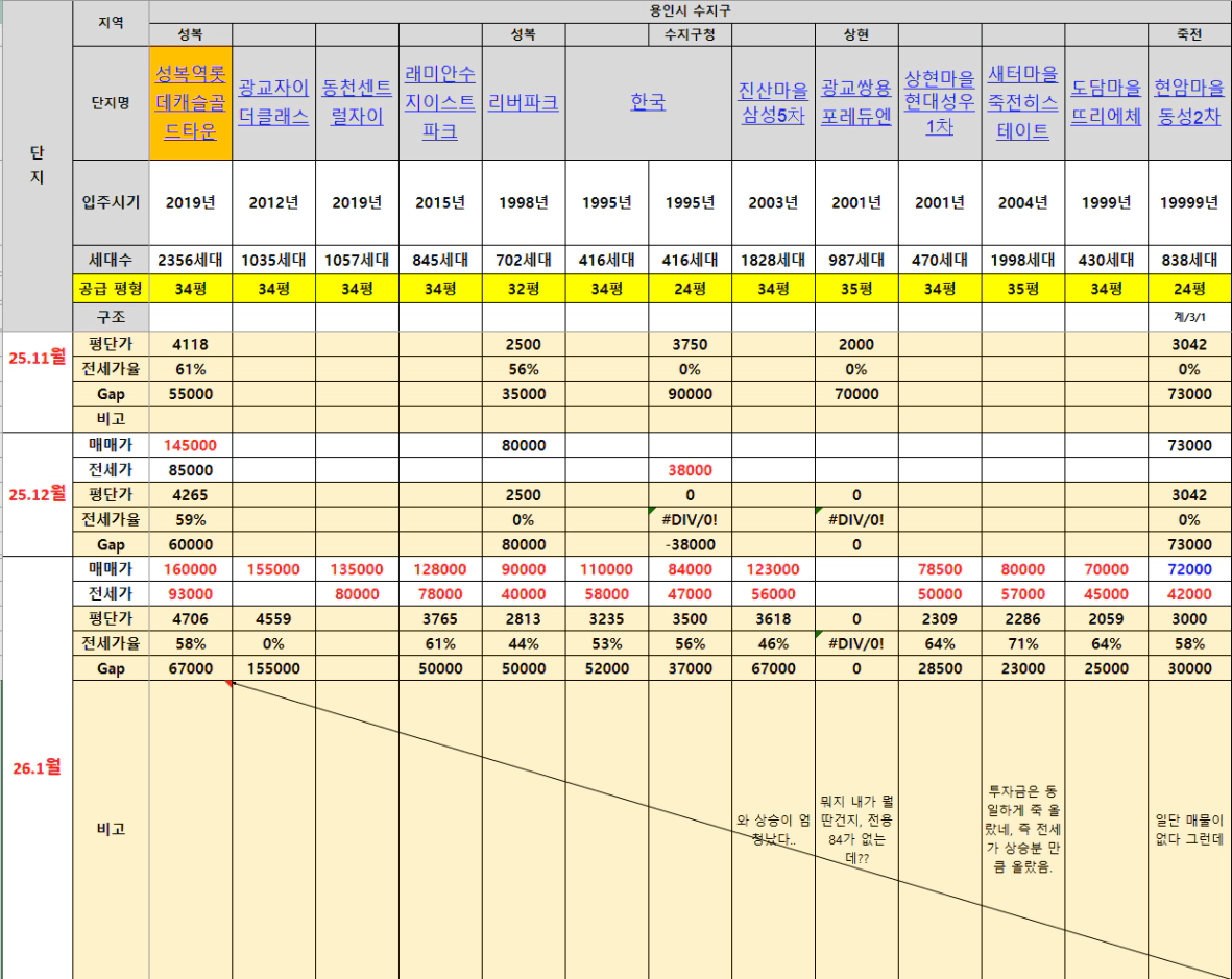 특히 새터마을 죽전힐스테이트를 보면, 24년 12월에 작성한 보고서에서도 투자금이 2.3억이 들었는데, 지금 가격이 1.6억 상승한 시점에서도 투자금이 2.3억이 든다. 즉 죽전 안쪽 생활권에서는 전세가 상승분 만큼 그대로 매매가가 상승한 모습을 보인다.