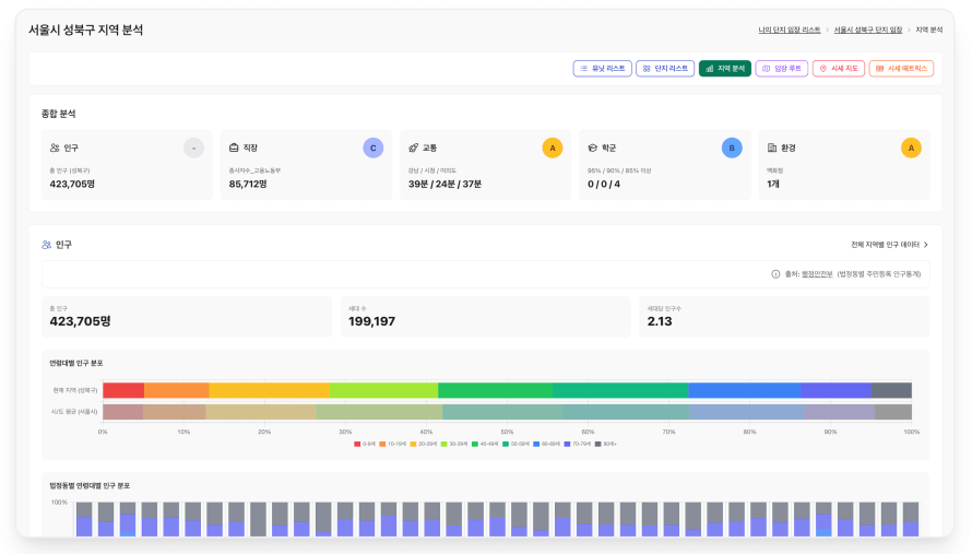 인구, 직장, 교통, 학군, 환경 등의 통계 데이터를 가져와서 한 페이지로 보여줍니다.