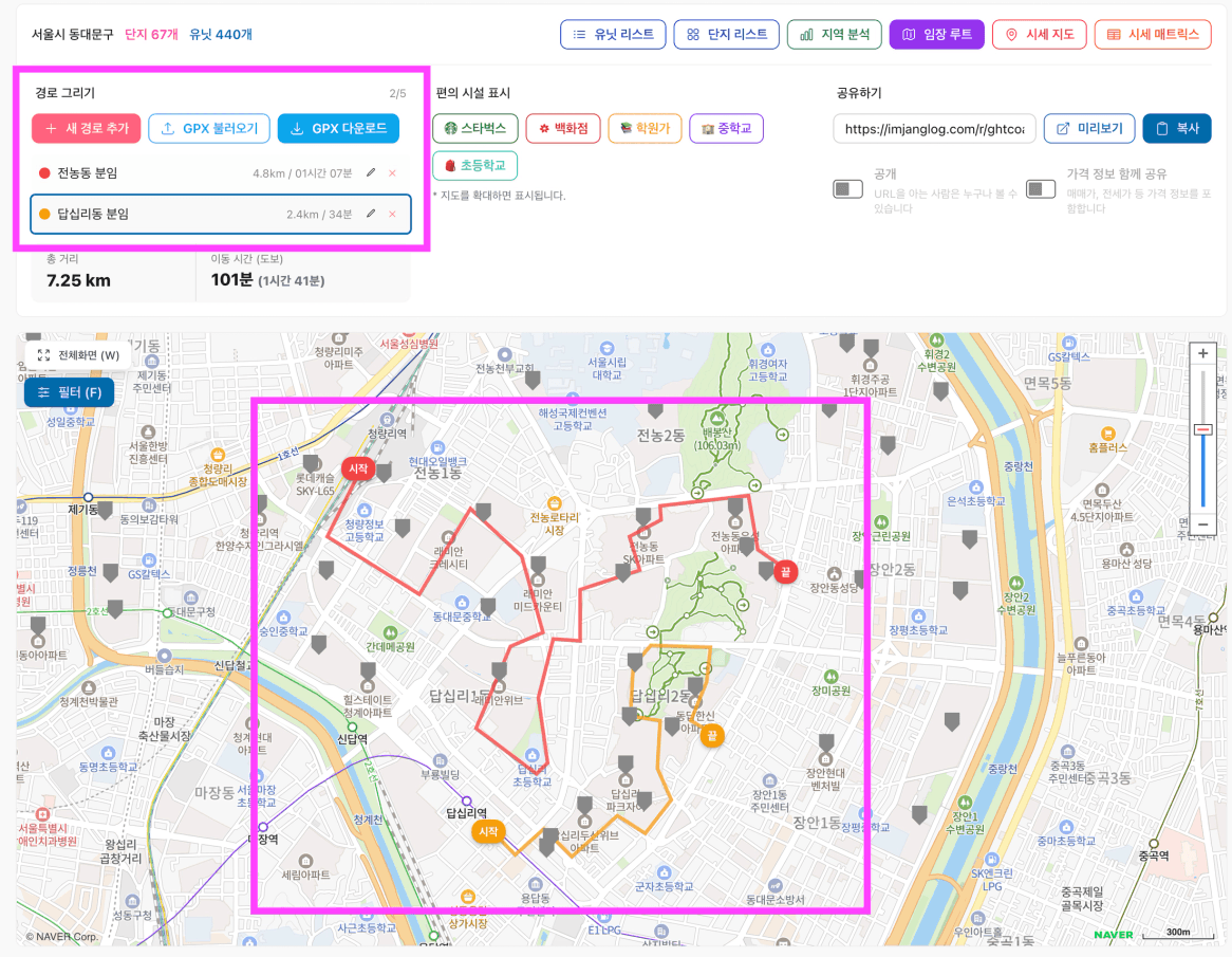 최근 하나의 임장 루트 지도에 여러개의 경로를 그릴 수 있도록 업데이트 되었습니다.