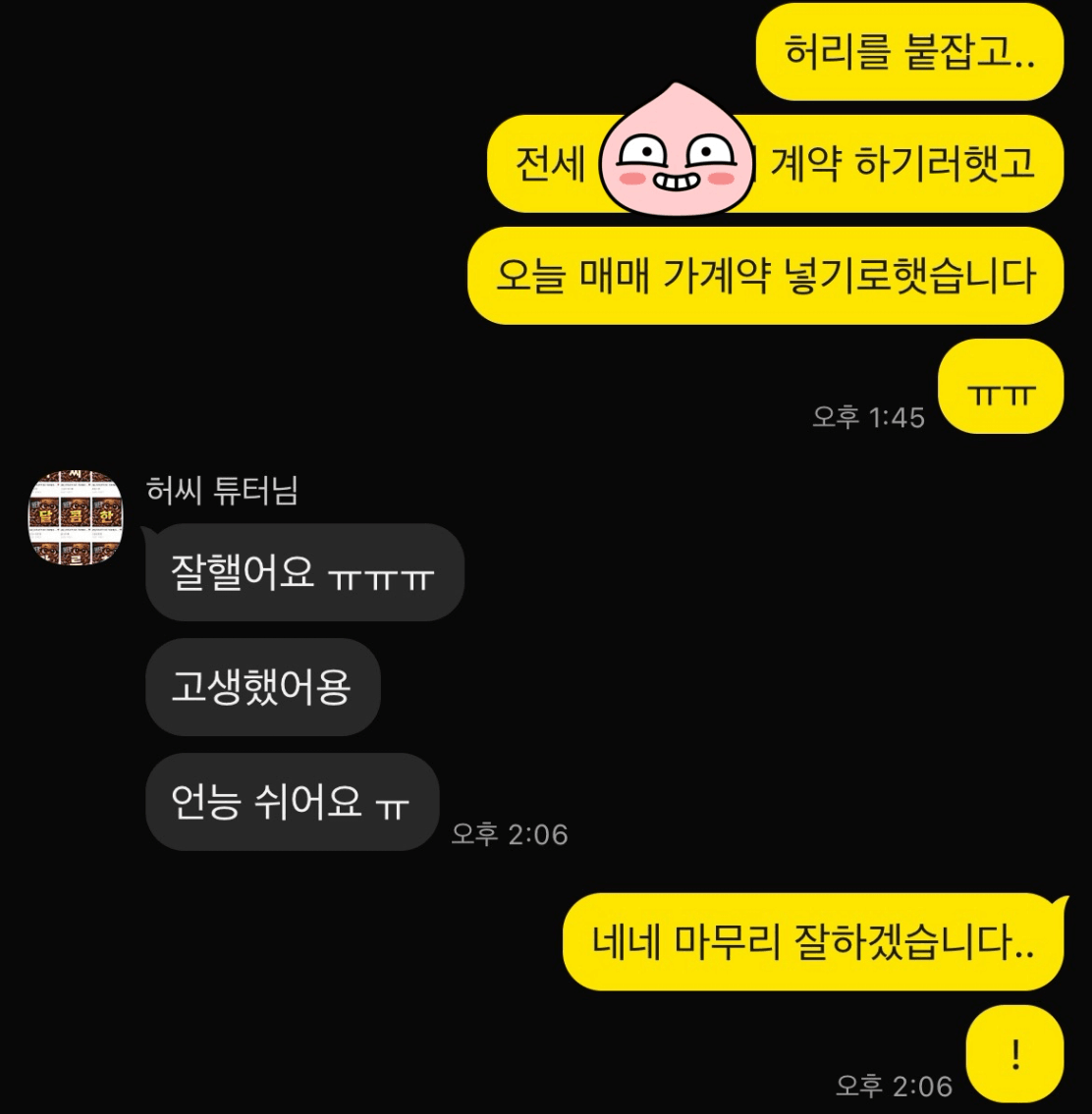 부사님과의 관계가 오히려 전화위복이 되어서 계약까지 잘 마무리됐네요! 걱정했지만 그래도 지혜롭게 잘 마무리하신 것 같아서 다행이에요! 청년님 한달 동안 고생많앗어요. 너무 축하드려요~! 마무리까지 화이팅해요 ㅎㅎ