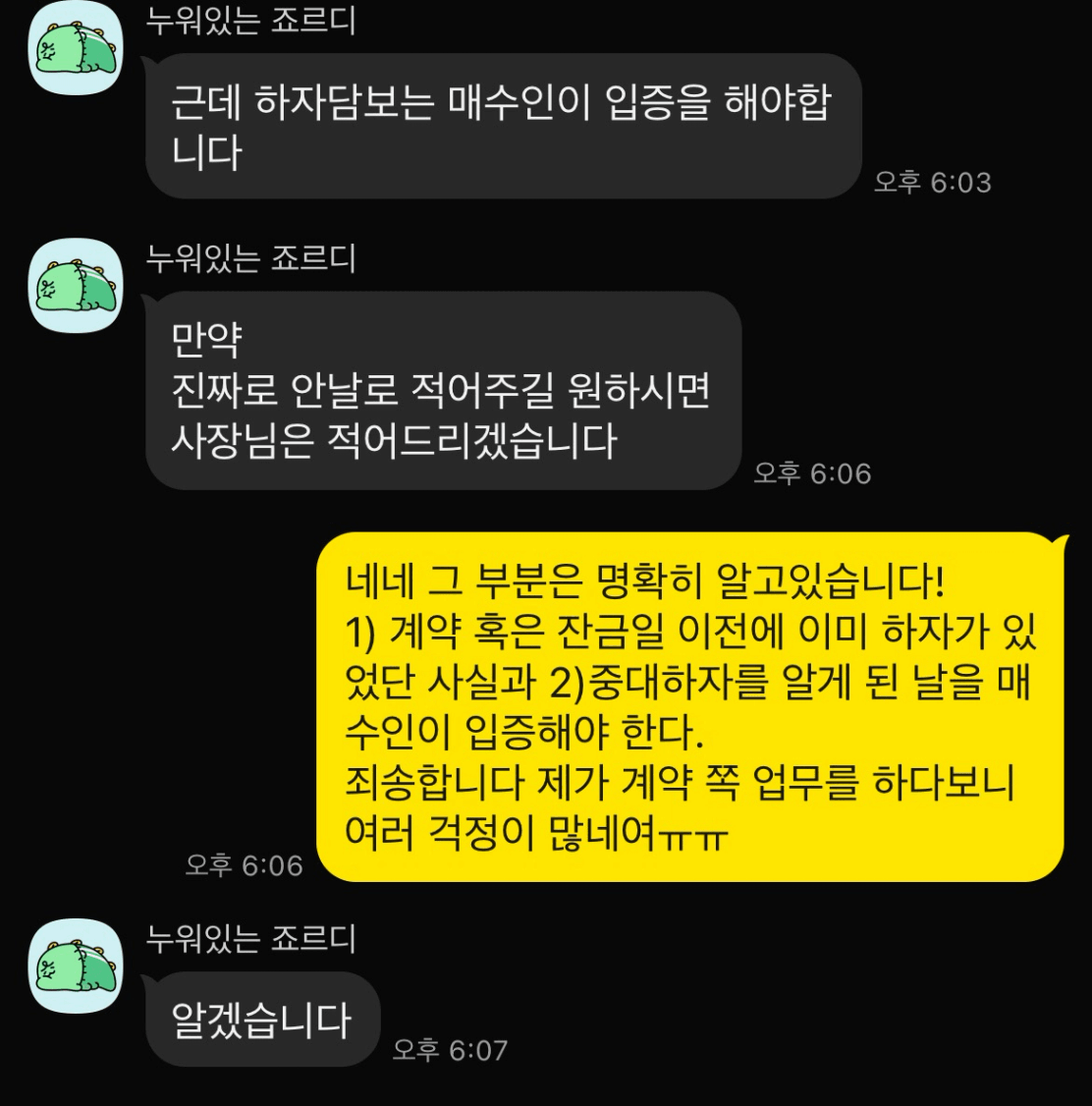 특히 중대한 하자담보책임 관련 특약에서 부사님과 명확한 의견 차이가 발생했습니다.