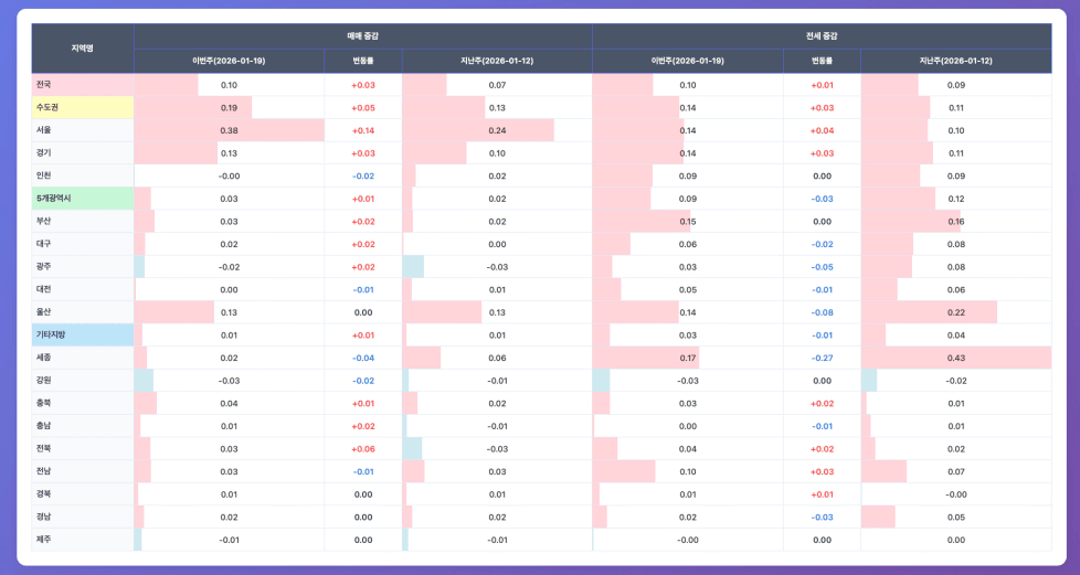 전국 및 권역별 매매/전세 증감 비교표를 보실 수 있습니다.
