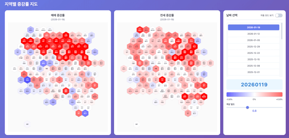 지도 차트로 매매, 전세 증감률 데이터를 특정 날짜 또는 날짜 자동 선택으로 매매, 전세 증감률의 변화를