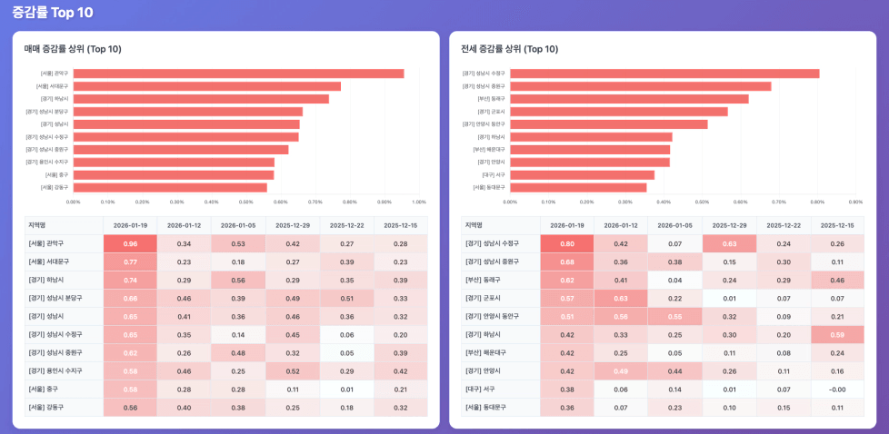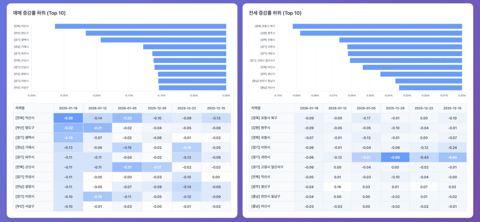 매매/전세 증감률 상위, 하위 Top 10개 지역에 대한 차트를 보실 수 있습니다.