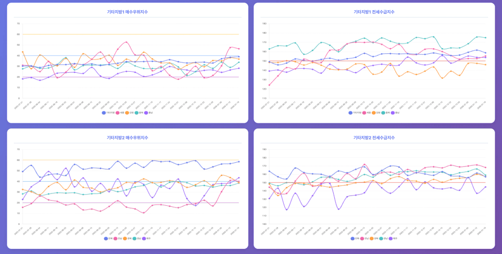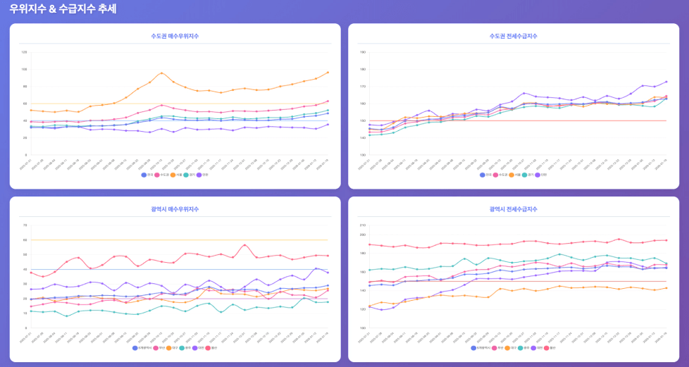 권역(수도권, 광역시, 지방)별 매수우위지수, 전세수급지수 차트 (업데이트일 기준 최근 6개월치 데이터)를