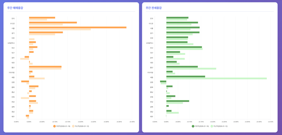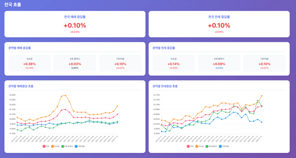 전국, 광역별 매매/전세 증감률과 권역별 차트(업데이트일 기준 최근 6개월치 데이터)를 보실 수 있습니다.