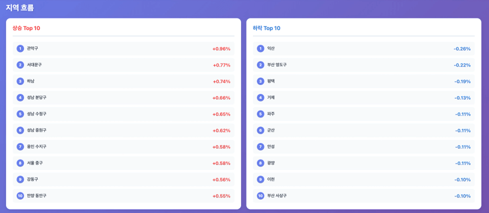 지역별 상승/하락 10개 지역, 주간 매매/전세 증감 비교(이번주 vs 지난주),