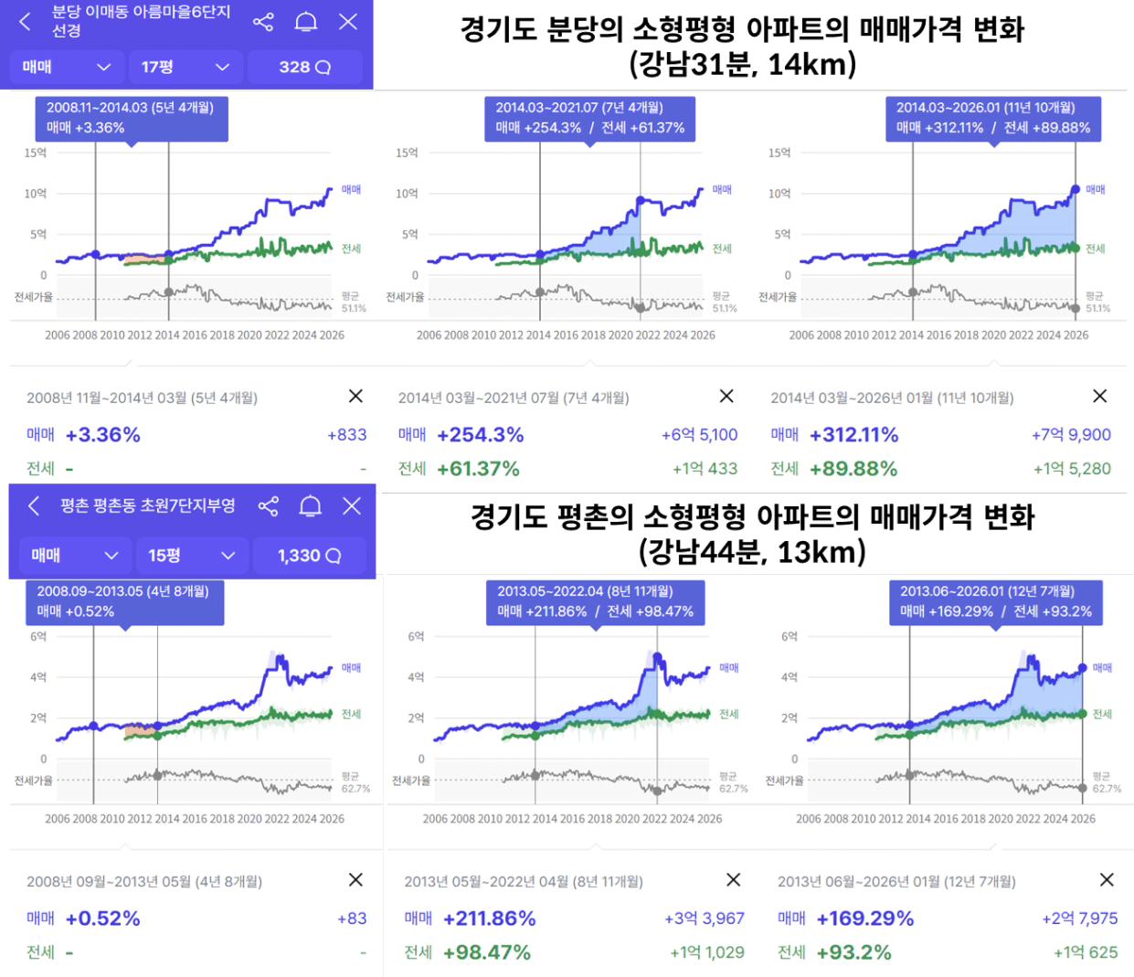 평촌은 지난 전고점보단 낮지만 여전히 2.5배의 가격을 형성하고 있습니다.