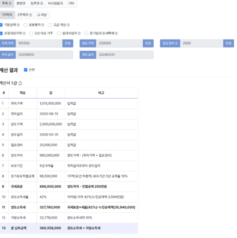 양도소득세 + 지방소득세 = \551,078,000 (약 5.5억)