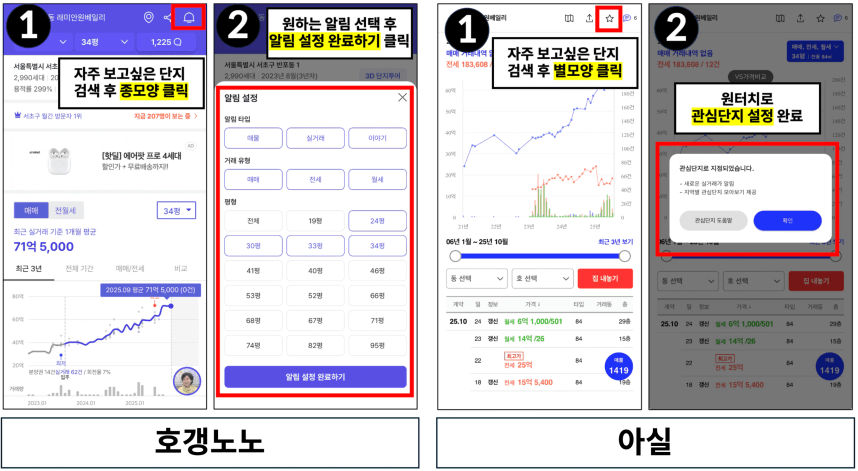 • 아실 및 호갱노노에 ‘관심단지 알림설정’을 해두세요.