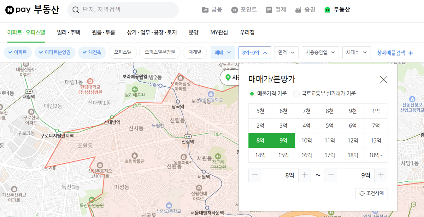 네이버 부동산에서 필터를 걸어 8억짜리 아파트가 어디있는지부터 찾아보시면 좋습니다.