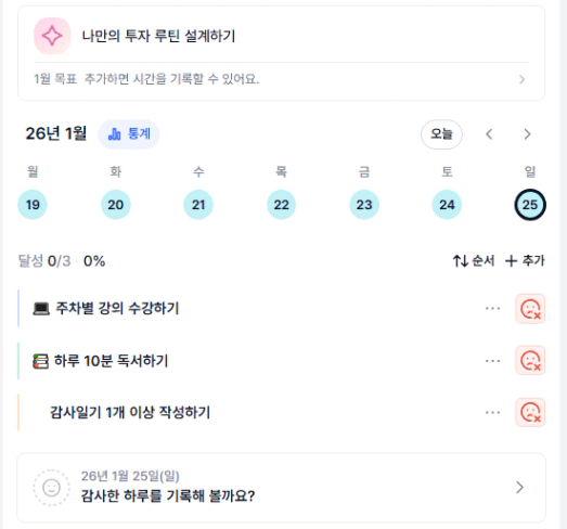 매일 해야 하는 일을 관리할 수 있어서 좋았습니다. 주말엔 일이 있어서 과제를 달성하지 못했지만요.