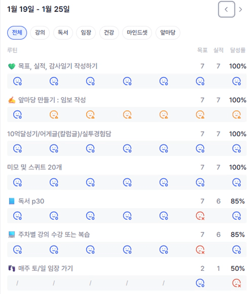 독서, 매일 목실감 작성, 미모 및 운동(스쿼트 20개), 매주 주말 임장 모두 100% 목표 달성함.