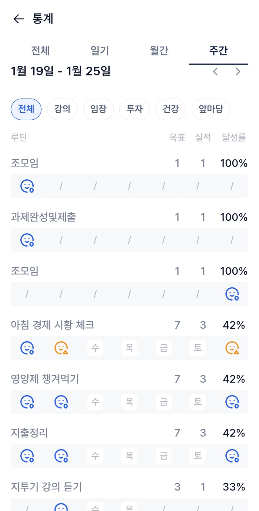 1월 초반보다 본업에서 맡은 일이 늘어나면서 열정과 시간 쏟음이 감소했다. 그렇지만 남는 시간과 체력에 최선을 다하고 있으니 낙담말고 어제보다는 조금 더 나아지자.