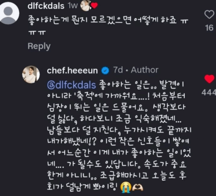 김희은 쉐프님의 댓글 내용인데요.