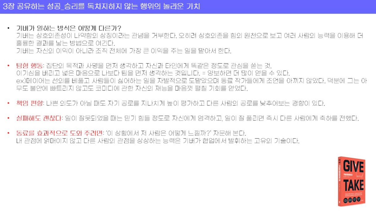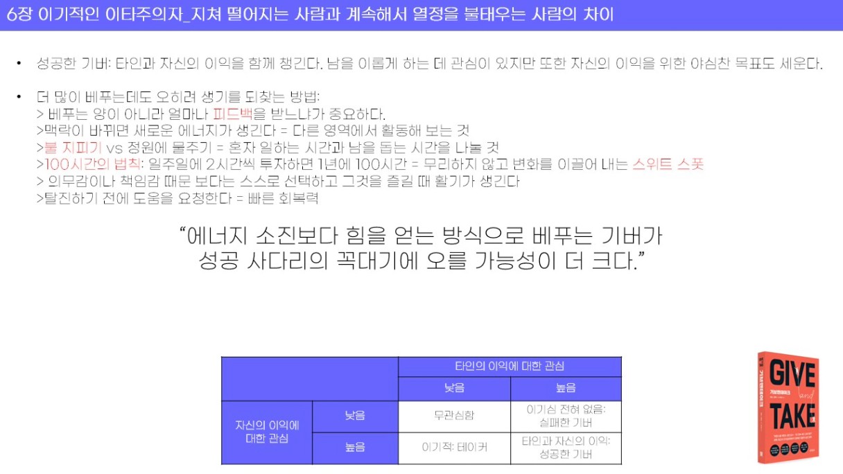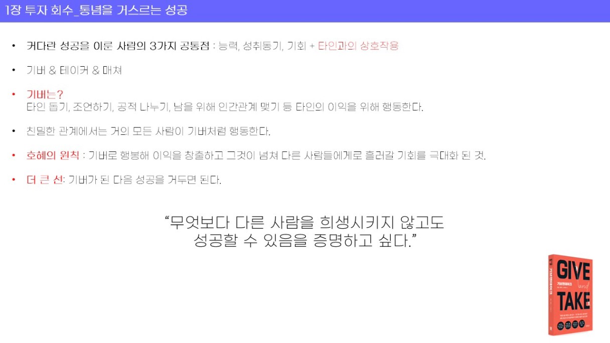지금은 타인과 나를 이롭게 하면서 성공하는 기버로서의 태도를 알고 진심으로 행해야 겠다는 생각이 들었다.