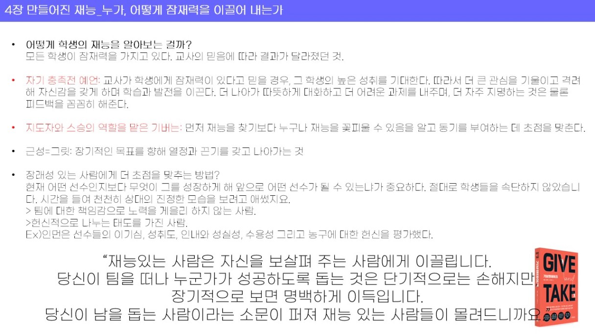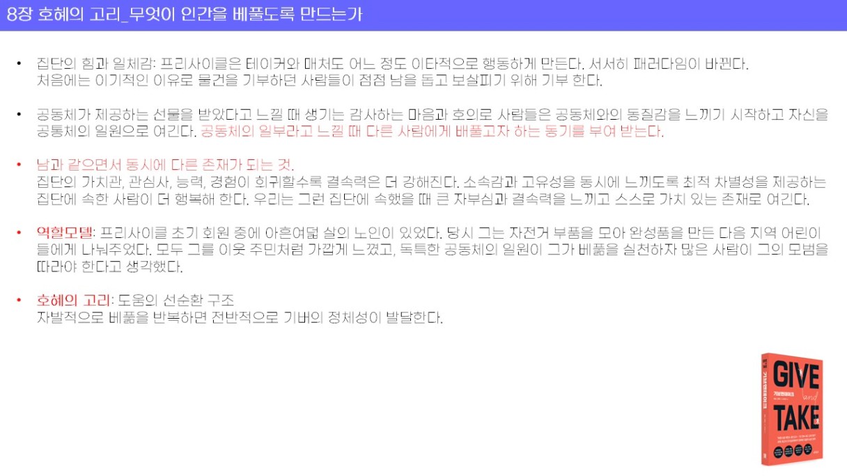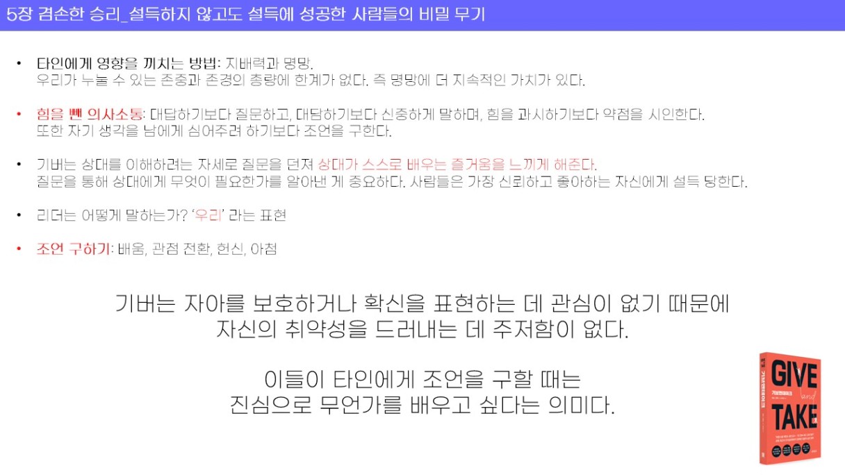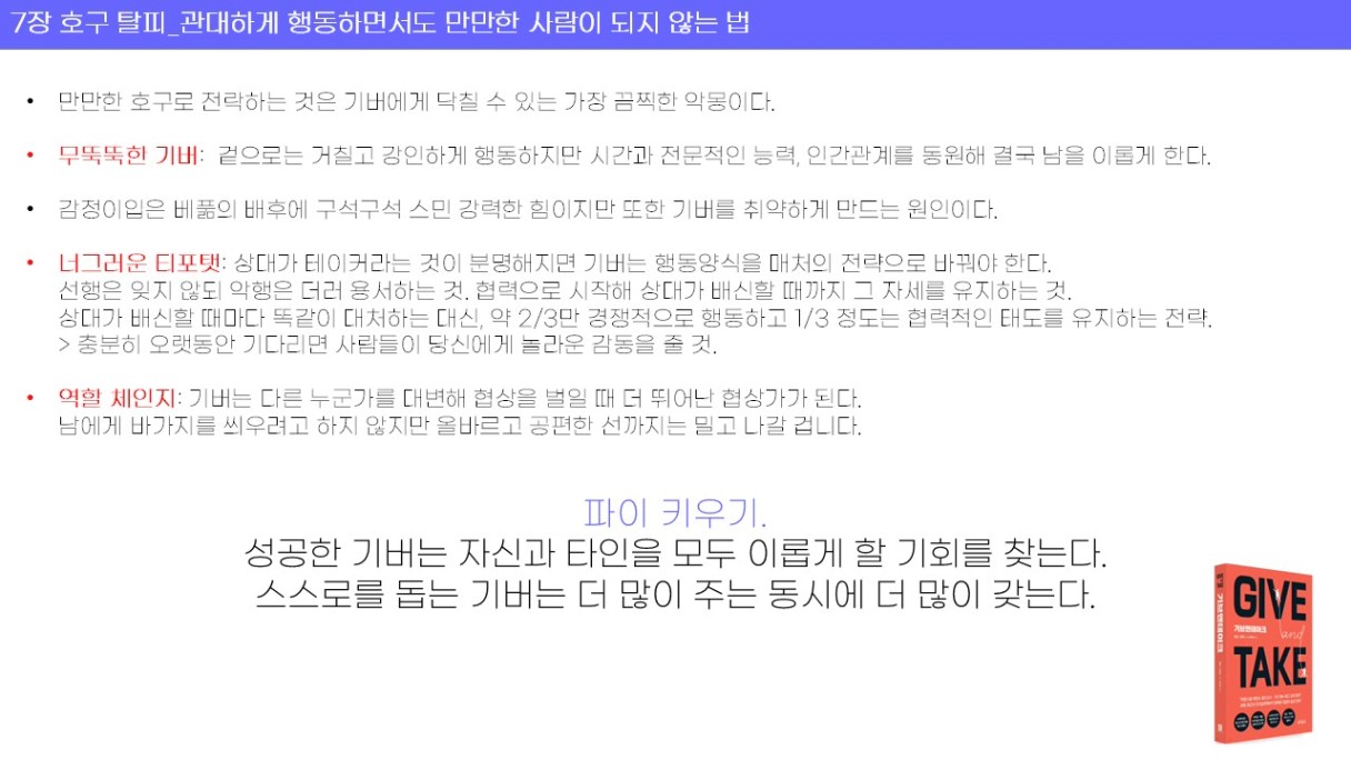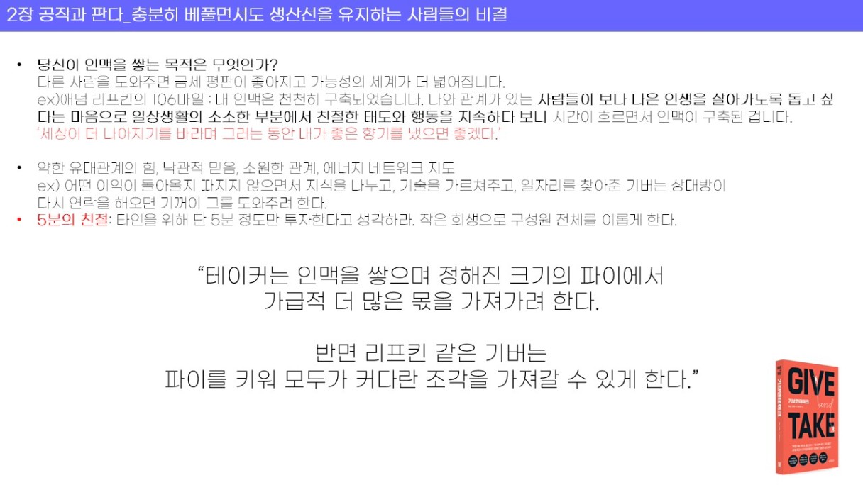 : 기브앤 테이크 재재독 이었지만, 읽을 때마다 조금씩 보이는 내용이 달라지는 것 같다.