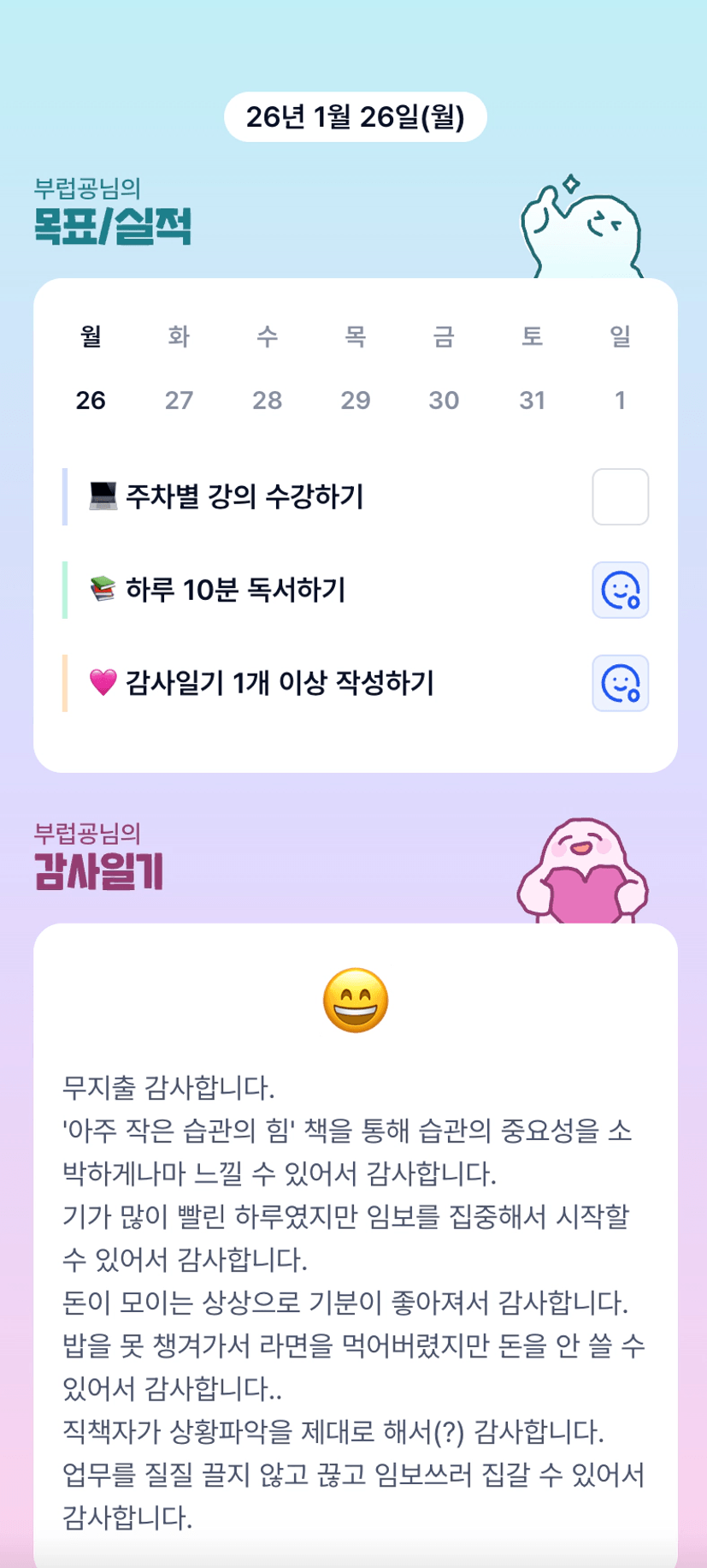 하루하루를 열정을 다해 이루고 있는 부럽님 너무 훌륭해용 ~~ 오늘도 화이팅!!!