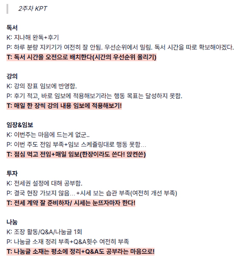 P: 독서 시간 확보가 어려웠음. 2주차 복기 내용이 지켜지지 않음.