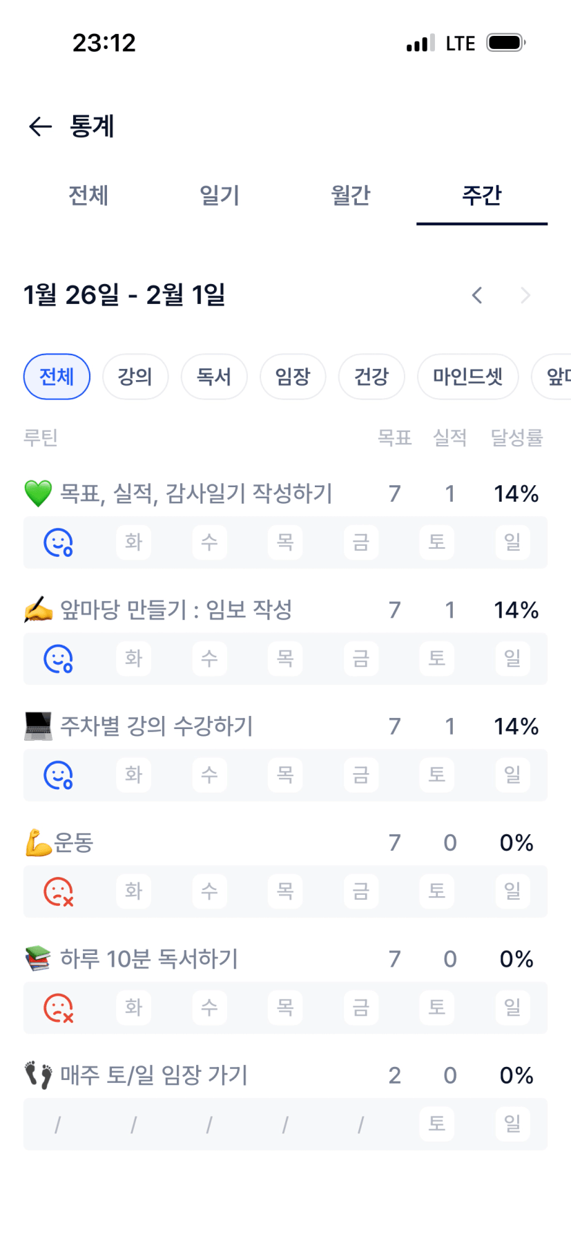 예) 토요일부터 목요일까지 목실감을 쭉 하루하루 적어보면서 스스로 중요한 부분은 놓치지 않고 해낸 것 같아 뿌듯하다.