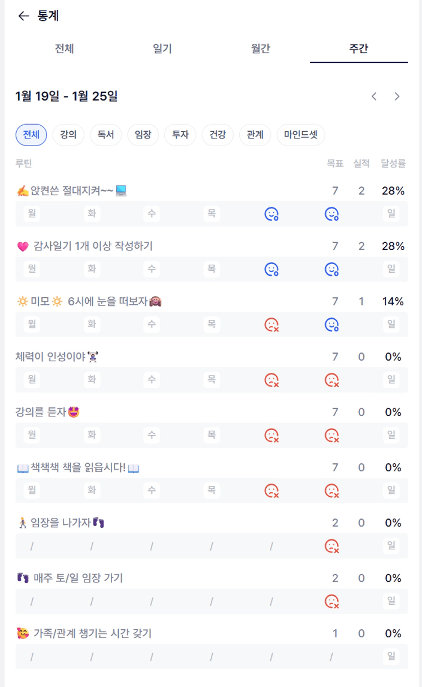 1️⃣ 목실감 - 통계 - 주간으로 들어가 이번주 나의 목실감 현황을 인증해주세요 ! :)