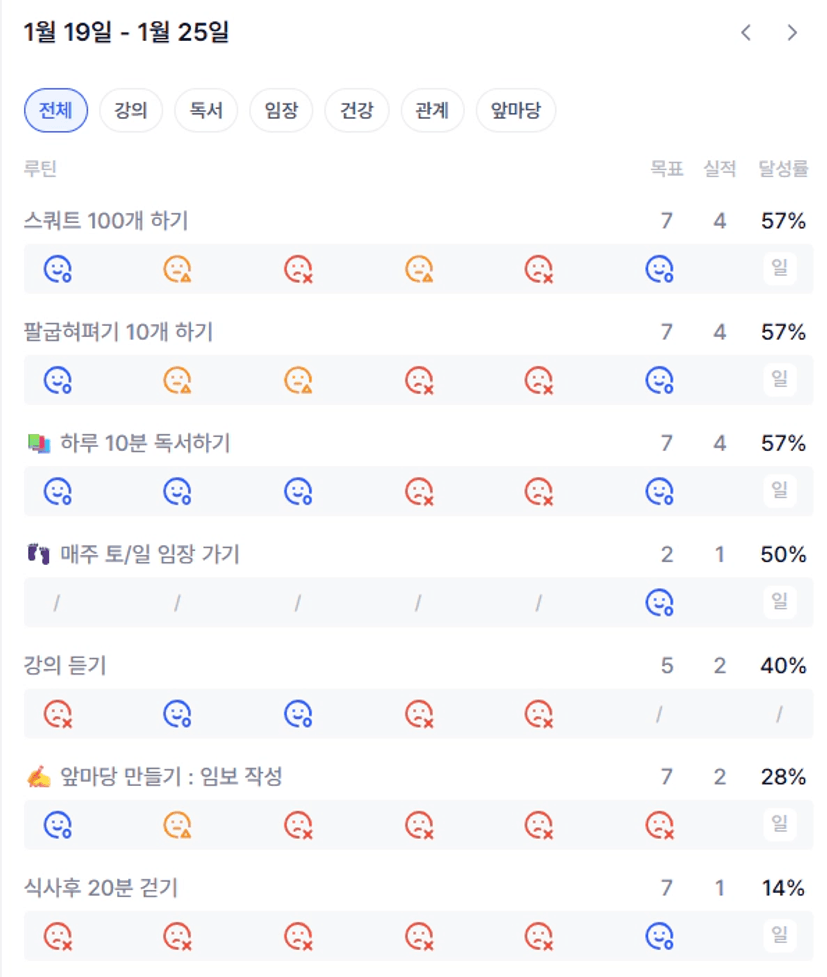 목실감에서 매일 꾸준히 하는 것이 별로 없어서 아쉽다. 다음주는 더 꼼꼼히 챙겨야 겠다. 강의를 한 번 듣고 복습을 해야하는데 임보를 쓰느라, 출장을 다녀오느라 못 듣는 날이 많았다. 다음주에는 운동과 강의 복습을 더 챙겨야 겠다.