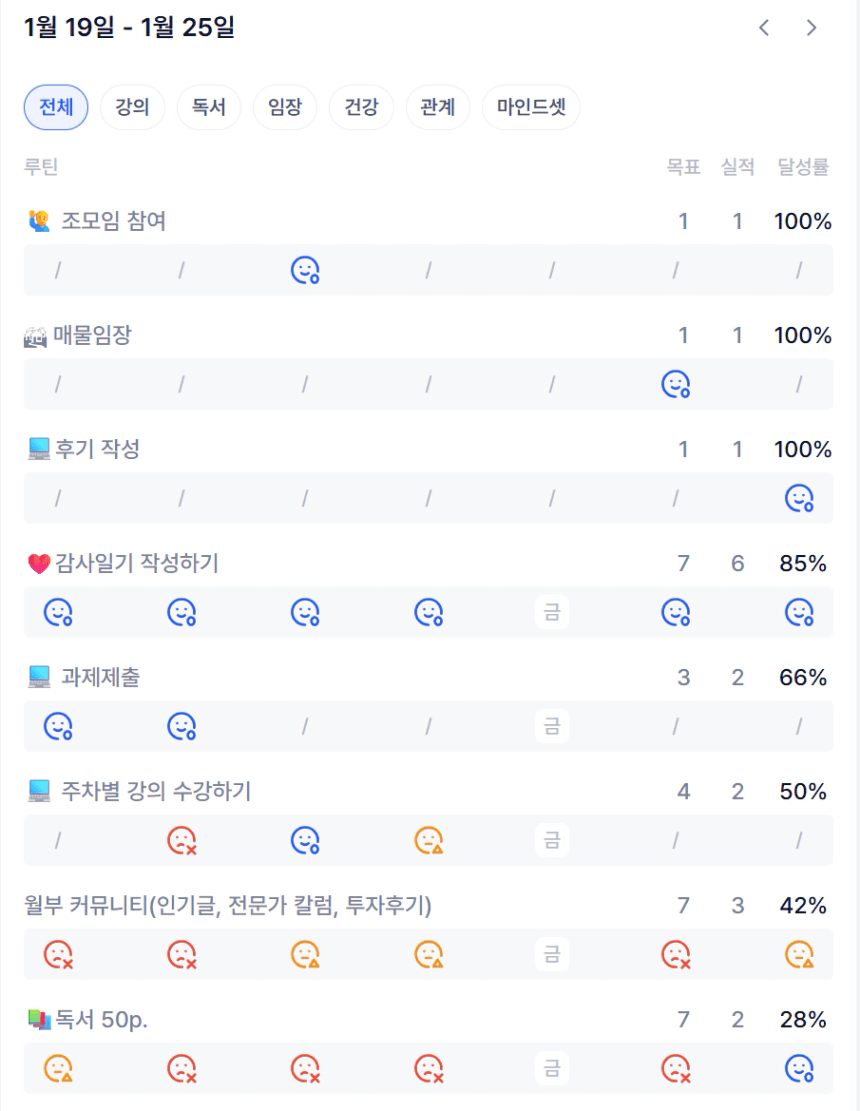 이번 주는 목표로 했던 일들 중 상당 부분을 완료했으나, 제대로 과제 제출을 하지 못하고, 독서를 등한시 한 것이 확인된다. 이런저런 핑계는 댈 수 있겠으나 반성이 되는 한 주다. 특히 어떻게 하면 독서를 루틴화할지 고민이 되기도 한다. 그리고 특정한 일 하나에 억매이기 보다는 선택과 집중이 필요해보이기도 하다.