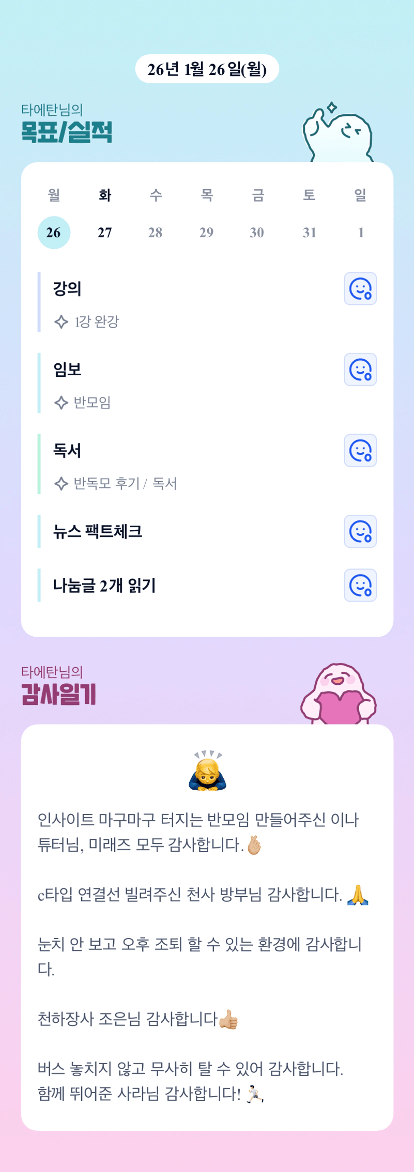 탄님 오늘 만나서 넘 좋았어요. 게다가 바로 옆자리라니 ㅎㅎ 발표와 질문 모두 뾰족하게 해주셔서, 저도 옆에서 많이 배웠어요~!! 앞으로 남은 학교생활도 찐하게 보내봐요!!