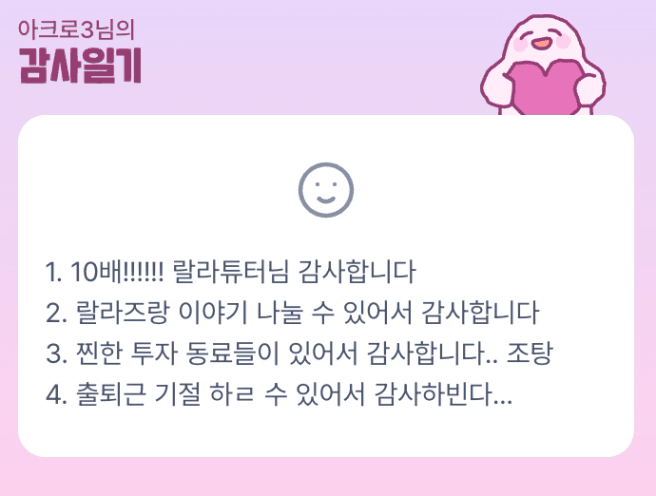 찐 한 투자 동료 ! 너무좋죠 !! 동료들이 있음에 계속할수 있는거 같습니다 !! 파이팅입니다 크로님