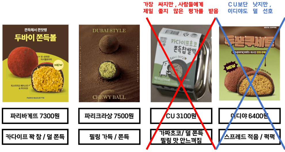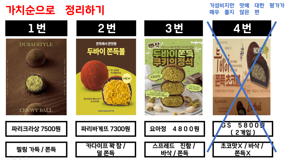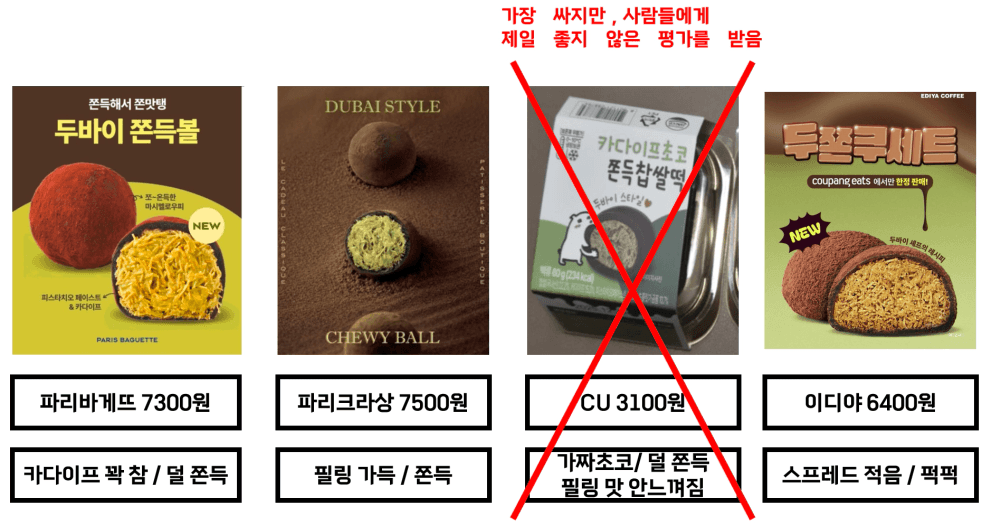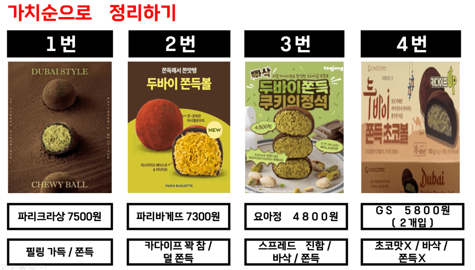 저라면 가격은 가장 싸지만, 가치도 가장 떨어지는 CU의 두쫀쿠를 소거시킬 것 같습니다.