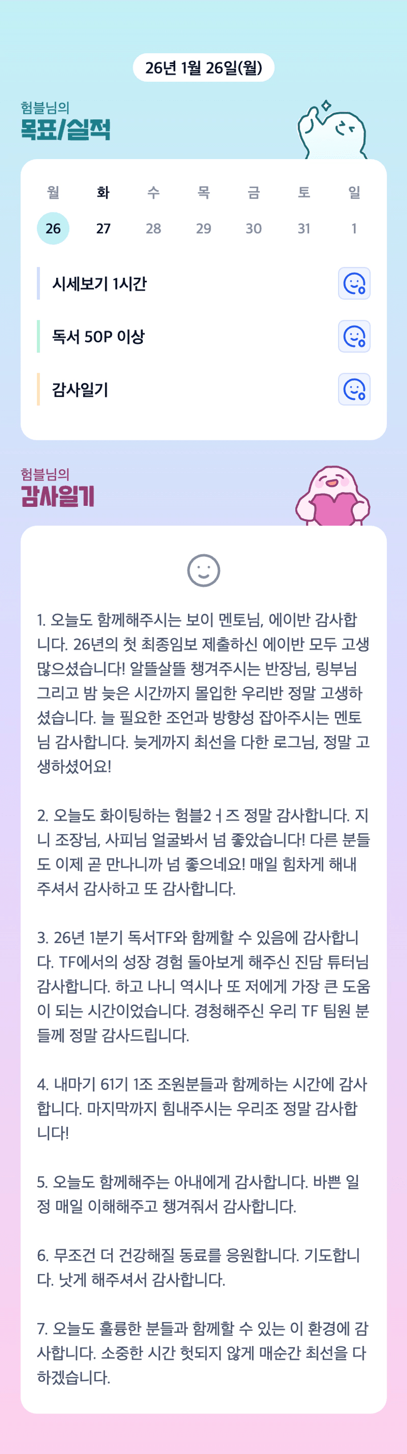 튜터님~ 건강챙기면서 하세욤^^ 늘 바쁘심에도 험블러즈 챙겨주셔서.. 챙김받아 기쁩니다~!!!