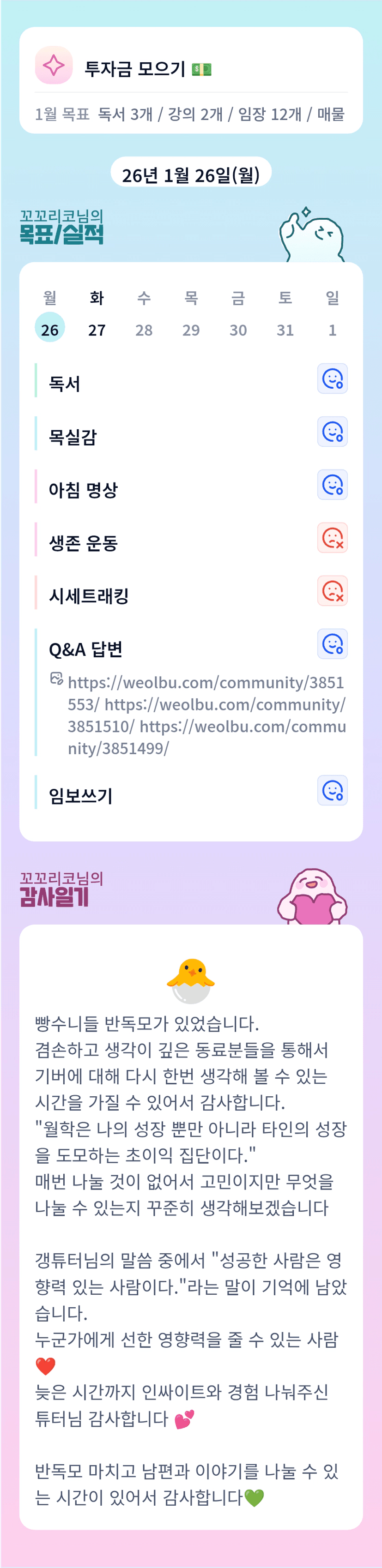 꼬님은 월부학교랑 정말 잘 어울리는 분 같아요! ㅎㅎ 착한 사람들 사이에 있으면 빛을 발하는 성향 :)
