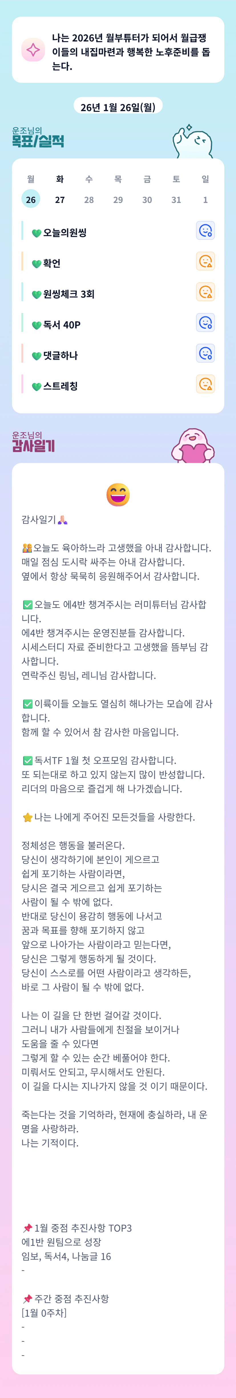 힘들어하는 동료들을 돕고, 때로는 함께 웃고 또 함께 울면서 해나가려고 합니다.