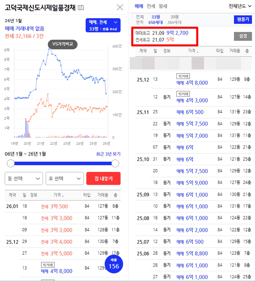 실제 고덕신도시 중심부에 위치한 단지의 경우, 현재 기준층 입주물건 기준 5.8~6.0억 사이에 매물이 다수 나와있습니다. 21년 당시 전고점인 9.27억 대비하여 37% 하락한 가격이죠.