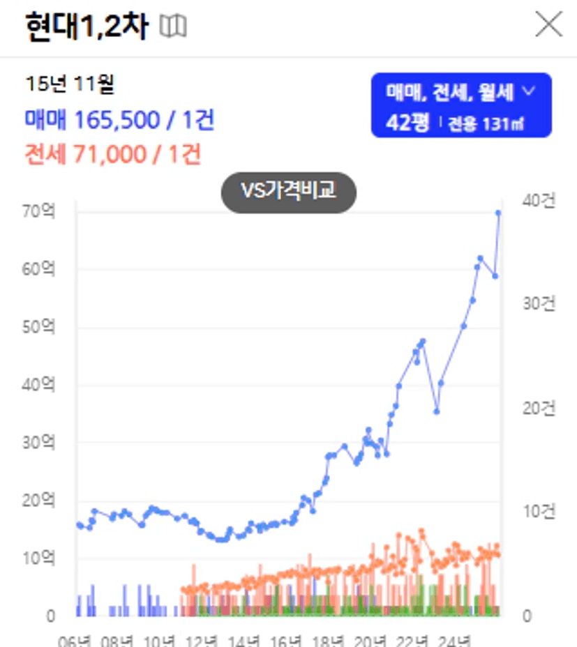지금 압구정현대는 70억원에 실거래가 되었습니다.