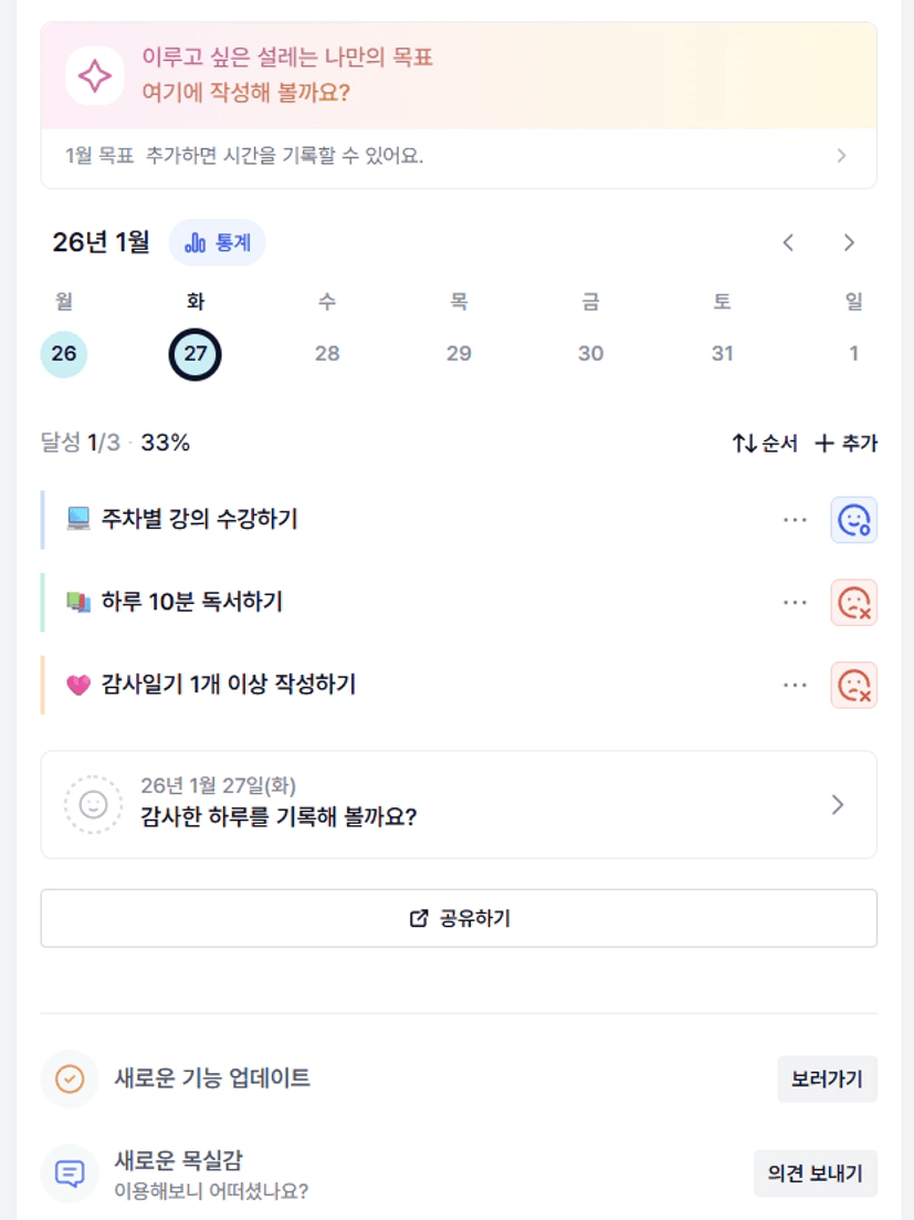 매일 매일 내가 해야하는 일을 기록해두고 목표를 달성해보니 하루 하루 성장하는 나의 모습에 뿌듯하였습니다.