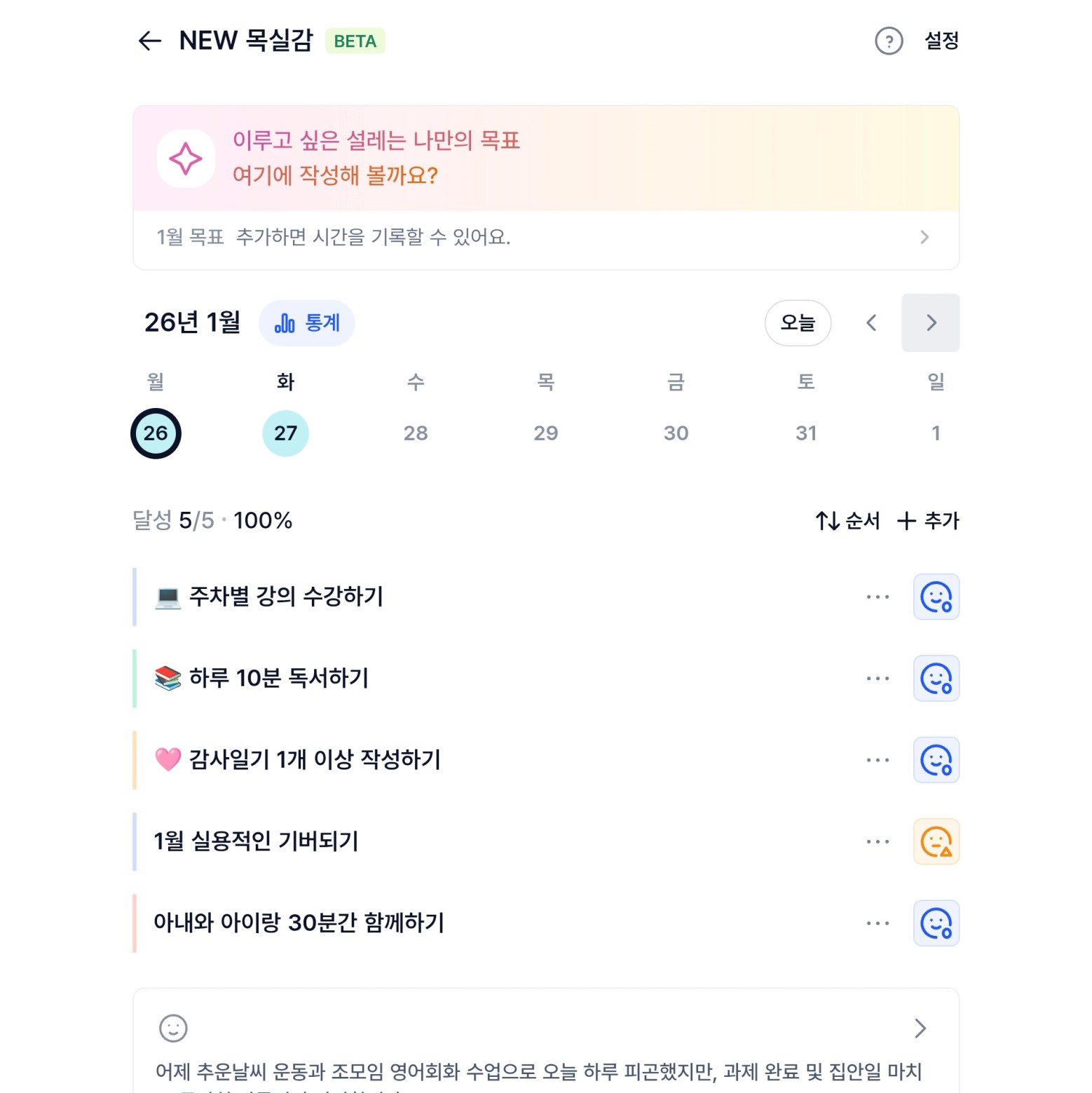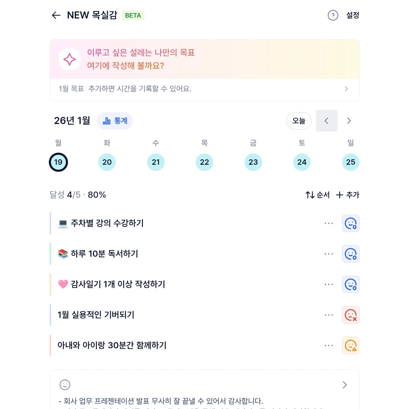 오랜만에 다시 써보는 목실감. 목표 달성여부를 체크하는 것도 좋지만, 무엇보다도 감사일기를 작성하면 할수록 삶의 만족도가 올라가는 것 같다. 감사일기를 쓰기 전에는 평범한 일상이 그저 지루한 삶이 였다면, 감사일기를 쓰면서부터는 평범한 일상이 행복하다고 느껴진다. 실제로 와이프랑도 “내가 지방에서 일을 안해서 주말 부부 안하는 것도 행복하다”, “이렇게 저녁에 퇴근해서 같이 함께 식사하는 것만으로도 행복하다” 라는 말을 이번 한달동안 많이 나눈 것 같다. 다음달 열반스쿨 실전반을 가고 나서도 이 목실감은 지속적으로 할 것이다~!