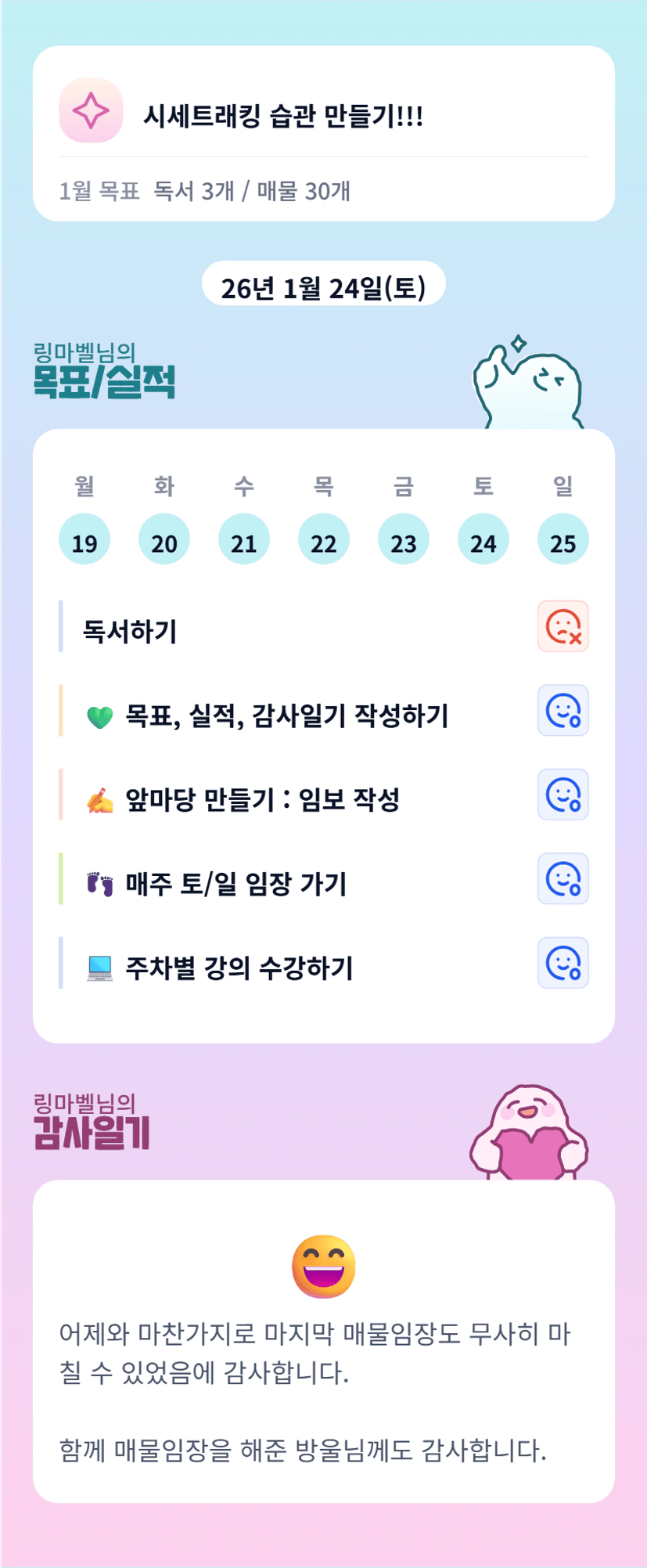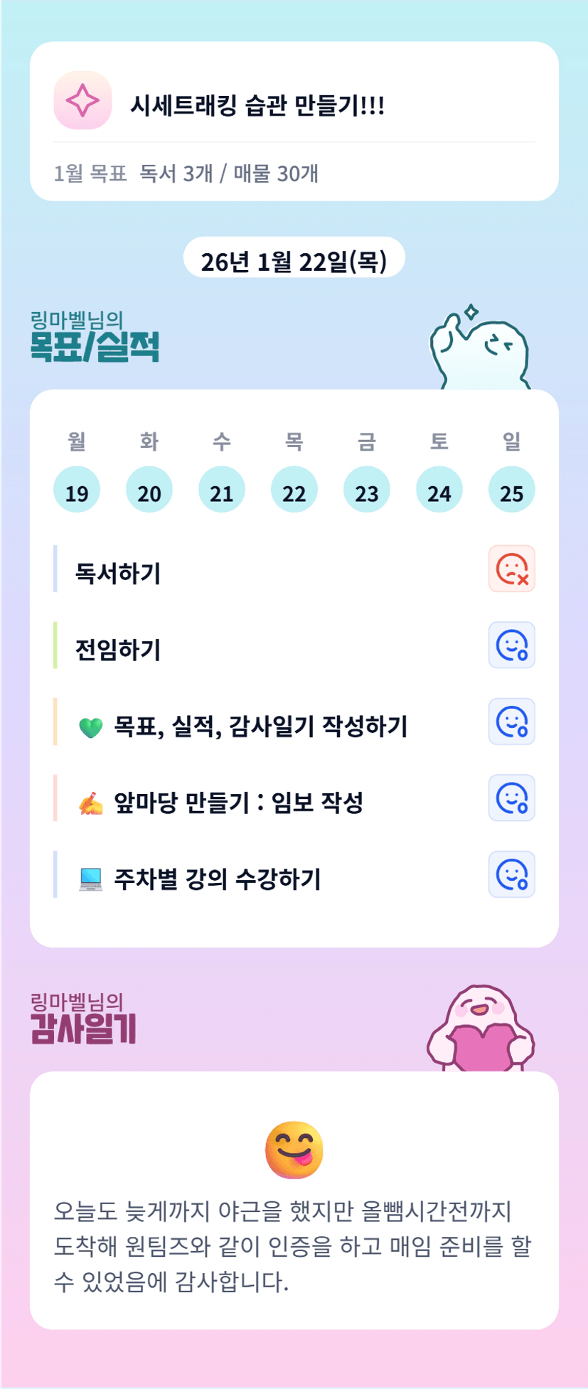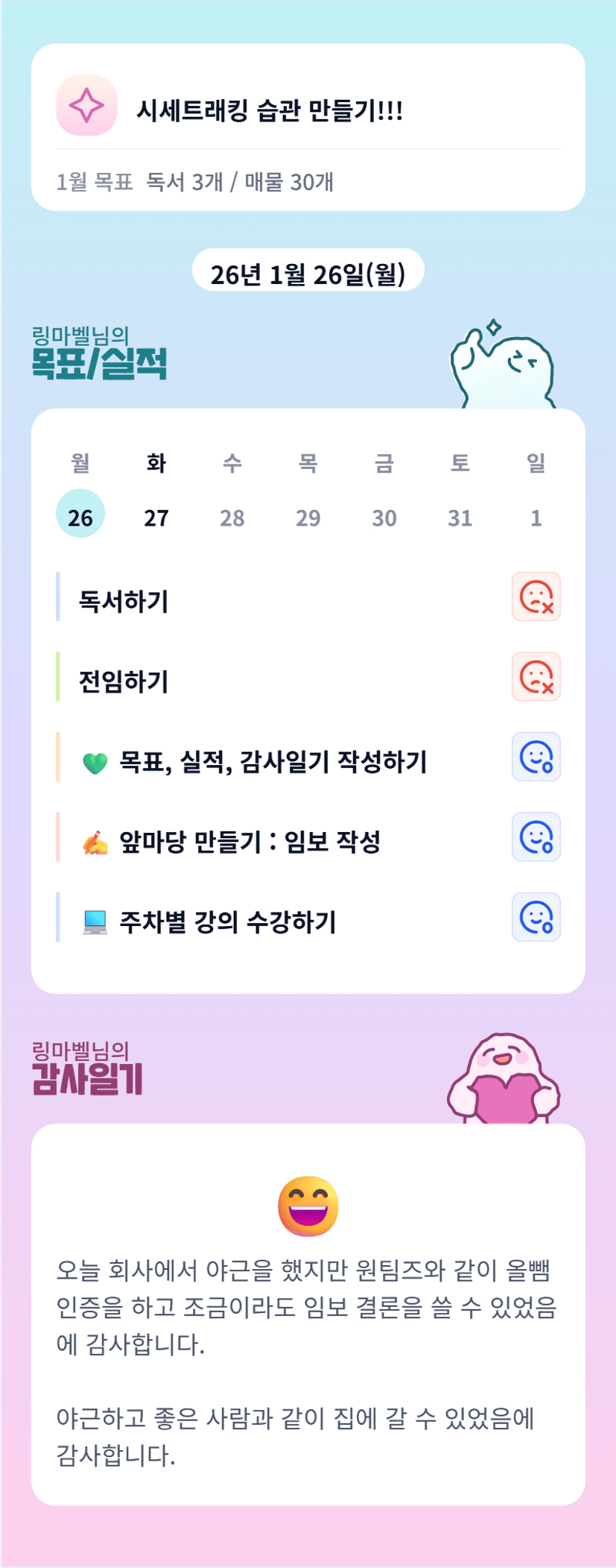 벨님 1월 한달 고생 많이 하셨습니다. 벨님 덕분에 올뺌이 즐거웠었고, 늘 재치있는 인증샷으로 웃음주셔서 감사했습니다. 😊🙏 2월 어느자리에 있던지 성장하실 벨님 응원하겠습니다! 화이팅!!!🌈😄💖✨️